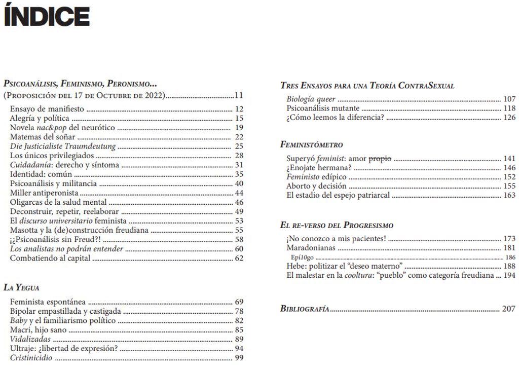 Este es un libro en torno al amor y a la política, es decir, en torno al psicoanálisis. El futuro será feminista si y sólo si peronista; de lo contrario será dilación, cuenta regresiva de un apocalipsis cuerdistamente machista, más acá del principio de placer.